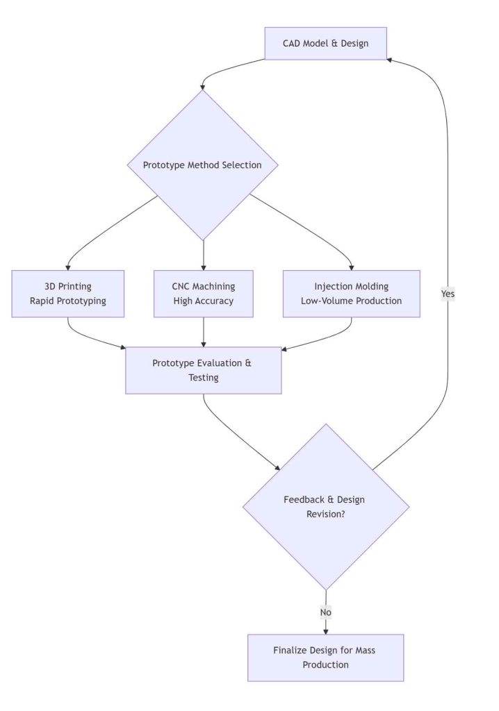 Once the design is finalized, the most suitable prototype manufacturing method is chosen. This decision is based on the prototype’s purpose (e.g., visual check, functional test), required material, lead time, and budget. Key methods include: