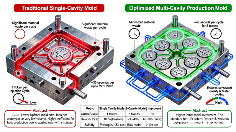 - Optimize for Multi-Cavity Production: A well-designed mold can have multiple cavities (e.g., 4, 8, 16) to produce several tokens per injection cycle. This dramatically increases output and reduces machine time per piece. Our mold design experts excel at creating efficient multi-cavity molds that maximize your bulk plastic coins production.