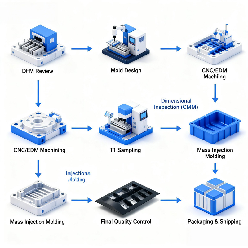 - Mold Manufacturing (CNC/EDM, polishing/texture, assembly)